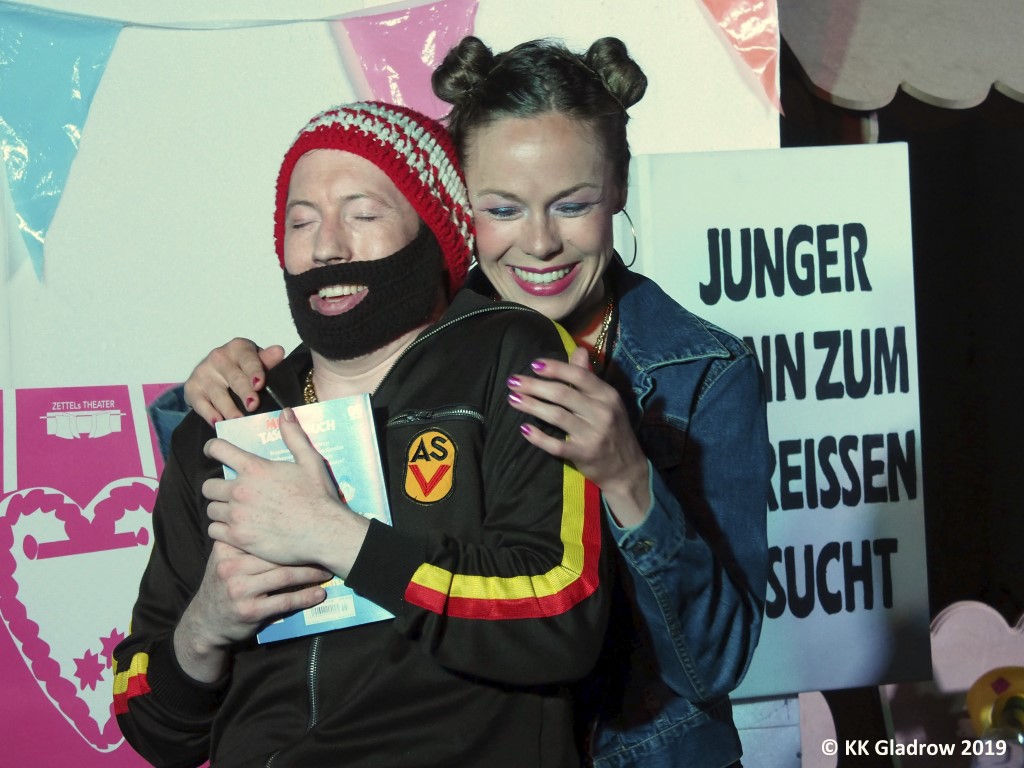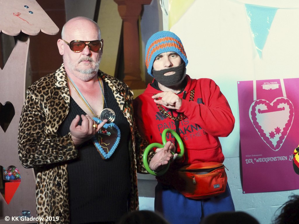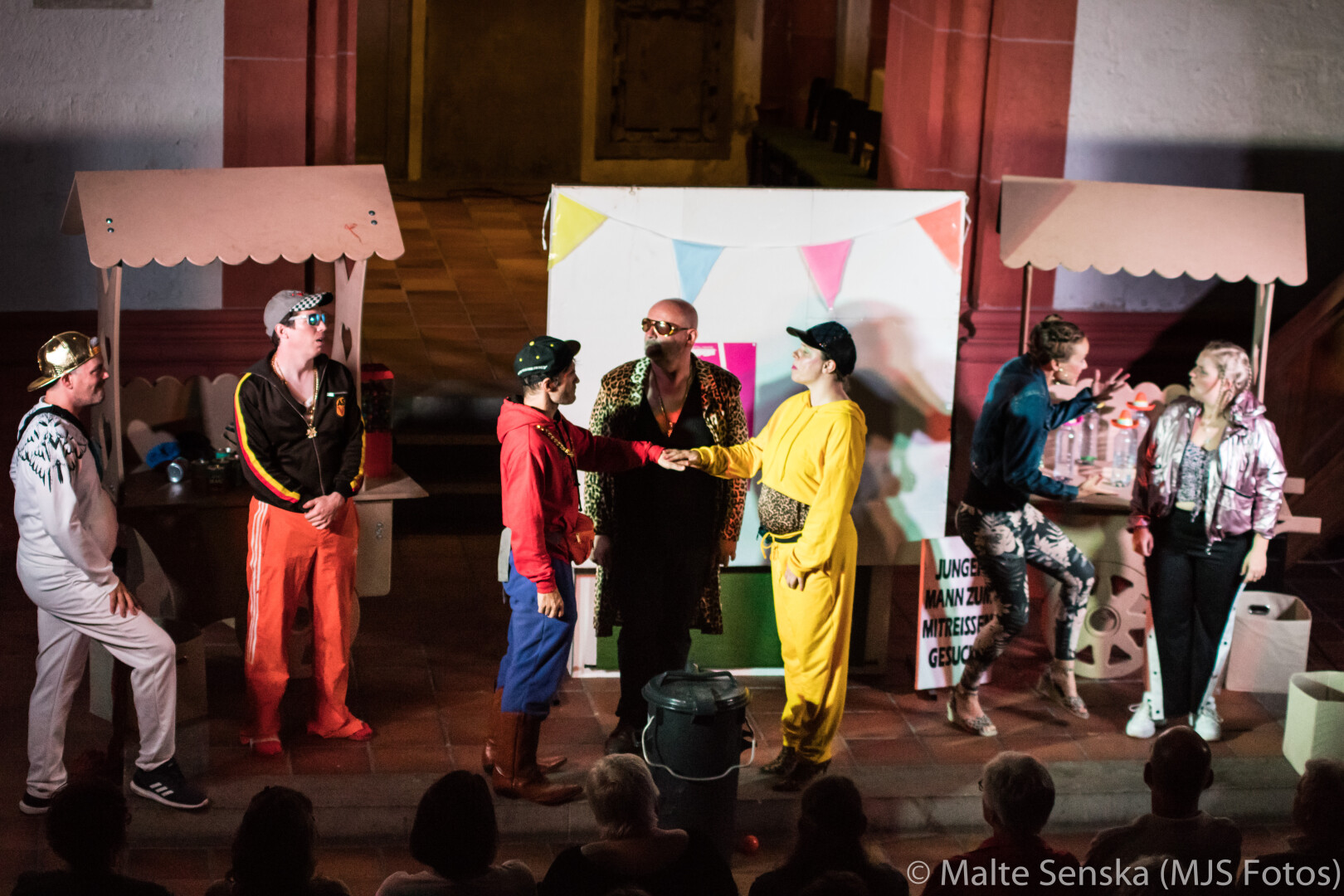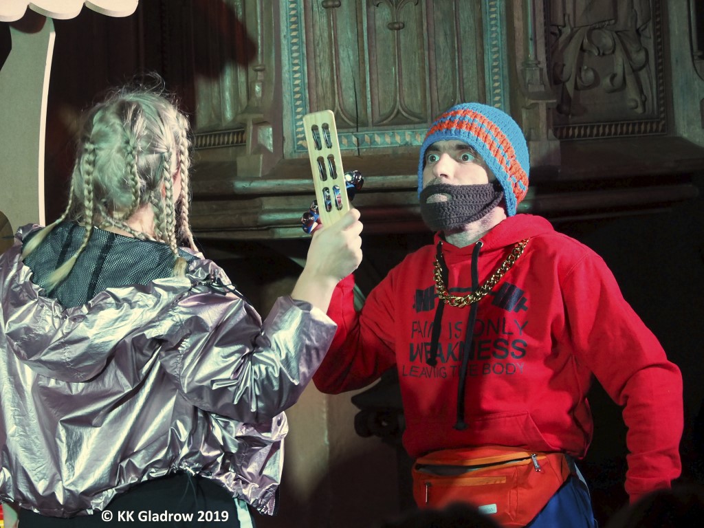 „Es ist mit Abstand das unpassendste Stück, um es in einer Kirche aufzuführen“, meint Andreas Koch, als er die Zuschauer begrüßt. „Es ist unmoralisch und frauenfeindlich.“ Und mit einem Grinsen fügt er hinzu: „Besser, es würde in der katholischen Kirche gespielt.“ Dafür erntet er wissende Lacher. Koch hat die Geschichte der beziehungsunwilligen Katharina (Franziska Langer) ins Schausteller-Milieu transferiert. „Wenn schon sexistisch und frauenfeindlich, dann bietet sich dieses Umfeld durchaus an“, erklärt er nach der Vorstellung. Und er ist sich bewusst, dass diese Haltung nicht grade von „political correctness“ zeugt. Er selbst hat nicht nur Shakespeare umgewandelt und Regie geführt, er spielt ebenfalls mit. Als „Daddy“ von Bianca (Isabelle Stolzenburg) und Katharina kommt er protzig goldschmuckbehängt daher und will doch nichts lieber, als seine beiden Töchter schnell unter die Haube zu bringen. Das wäre bei Bianca kein Problem, sie hat zwei Verehrer. Hortensio (Stefan Senf) und Lucentio (Jonathan Roth), obschon Rivalen, beschließen gemeinsam, der Kneifzange Katharina einen Gatten zu verschaffen.