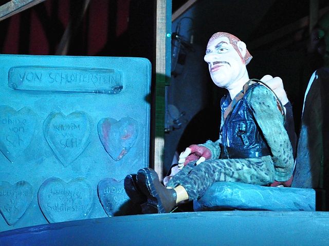 Aus etwa 200 Puppen besteht ihr Fundus an hölzernen Akteuren. Geschnitzt und bekleidet werden die Puppen von Barbara und Günter Weinhold, Theaterfigurenbauer aus Berlin. Arme, Beine und Charakterköpfe sind aus Lindenholz geschnitzt und bemalt, die Kleidung fantasievoll genäht. Geführt werden die hölzernen Schauspieler dieser Aufführung mit zwei Händen, eine bedient dabei auch den Mechanismus des Kinns, die die Mimik der Puppen so lebendig macht. “Sie sind wie Faden-Marionetten, nur ohne Fäden”, erklärt Sperlich.