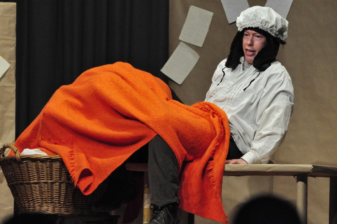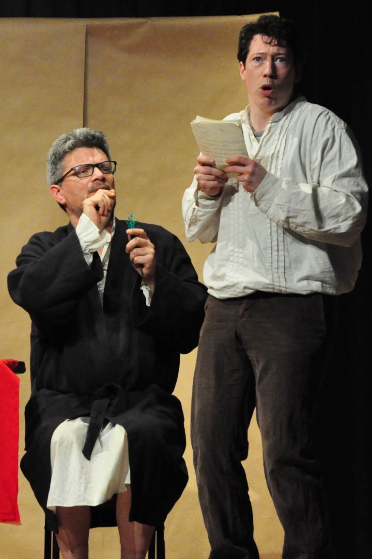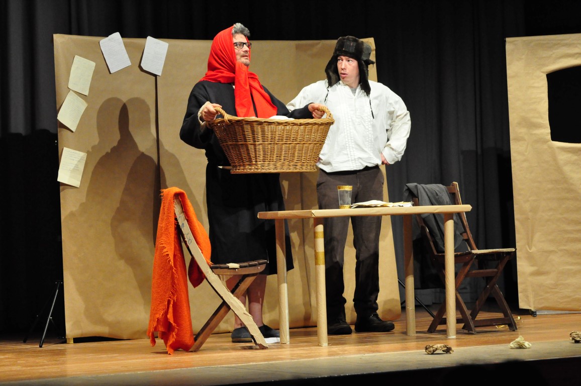 Wilhelm überrascht Jakob mit einer Idee: „Märchen sammeln“. Jakob ist nicht erbaut: „Das ist doch Kinderkram.“ Er sieht sich als Wissenschaftler, als Sprachforscher, doch Wilhelm bietet all seine Überredungskunst auf, um den Bruder zur Mitarbeit zu gewinnen: „Wenn ich dir erst die Märchen erzählt habe“, verspricht er, „wirst auch du überzeugt sein.“ Das Erzählen – „Es war einmal…“ – wird zum Spiel, Jakob muss mitmachen, ob er will oder nicht. Mit der roten Tischdecke auf dem Kopf verwandelt er sich sogleich ins Rotkäppchen, was großes Gelächter hervorruft, später in die Großmutter mit Häubchen. Da muss eine Duschhaube herhalten, genau die Art von Requisiten-Minimalismus, der die Aufführung magisch und witzig zugleich werden lässt.