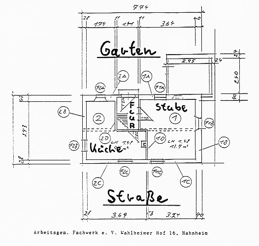 Im Januar 1996 begann die AGF Fachwerk mit den Schichtuntersuchungen in den Innenräumen Wie schon bei der Untersuchung der Außenwände, wurden auch im Innern die Befundstellen detailliert beschrieben und fotografisch dokumentiert.