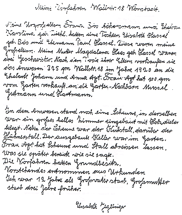 Meine Urgroßeltern Erwin Bös Ackersmann und Ehefrau Karoline geb. Diehl hatten eine Tochter. Elisabeth Hassel geb. Bös und Ehemann Paul Hassel. Diese waren meine Großeltern. Meine Mutter Magdalena Hees geb. Hassel waren drei Geschwister. Nach dem Tode ihrer Eltern verkauften sie das Anwesen 375 qm Wallstr.18 im Jahre 1920 an die Eheleute Johann und Anna Axt. Frau Axt hat 100 qm vom Garten verkauft an die Garten-Nachbarn Mussel, Gutmann und Hartmann.