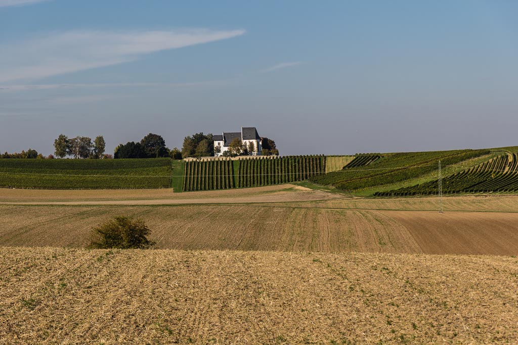 Hinter der Autobahn geht es nach ca. 300m nach links. Diesen Weg folgen bis vor der Bundesstraße. Von da geht es parallel zur B420 bis zum Mitfahrerparkplatz. Der Radweg geht dann auf der anderen Seite der Bundesstraße weiter. Die Überquerung der Straße ist nicht ganz ungefährlich da die Autos oft mit hoher Geschwindigkeit an dieser Stelle fahren. Den geteerten Weg nun folgen. Nach der Überquerung der L430 ist linker Hand die Udenheimer Bergkirche zu sehen.
