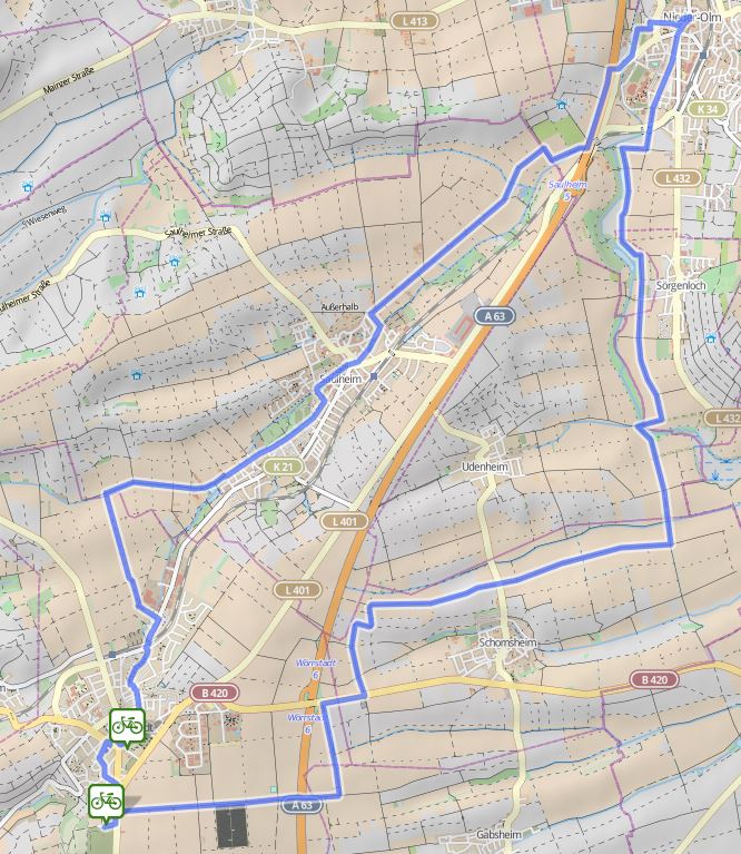 In Nieder-Olm geht es dann zum Marktplatz der zum Rasten einlädt. Hier verlässt der Rundweg den Selztal Radweg. An der katholischen Kirche geht es links rein durch die Gassen bis zur Umgehungstrasse. Hinter dem Sportplatz geht es über den Parkplatz wieder auf den Radweg. Dieser unterquert dann die Autobahn, um direkt dahinter dann links abzubiegen. Parallel zur Autobahn geht es in Richtung Saulheim. Ab dem Saulheimer Bach führt der Weg weg von der Autobahn. Leicht Bergauf und meistens bei Gegenwind (keine Ahnung warum aber es ist so) geht es schnurstracks weiter bis Saulheim. Dort angekommen geht es nach links den Berg runter bis vor dem Saulheimer Bach und dort wieder rechts. Quer durch Saulheim folgt der Weg nun dem Bachlauf bis zur Straße „Am Westring“. Dort geht es dann nach links um dann nach ca. 200m wieder nach rechts auf Ritterhund Straße einzubiegen. Dieser Straße wird dann bis zum Ende gefolgt. Über den Bach hinweg geht es dann wieder auf einen Landwirtschaftsweg der parallel zum Saulheimer Bach verläuft.
