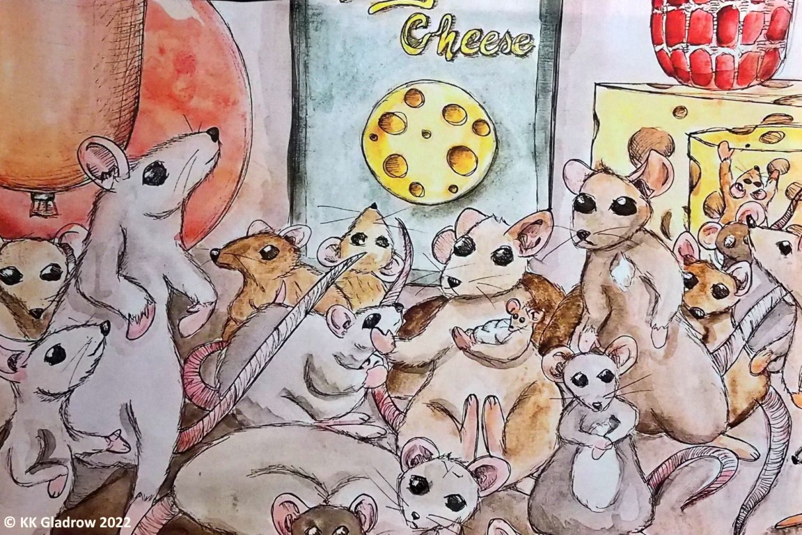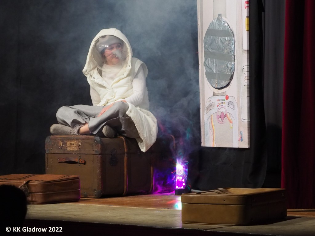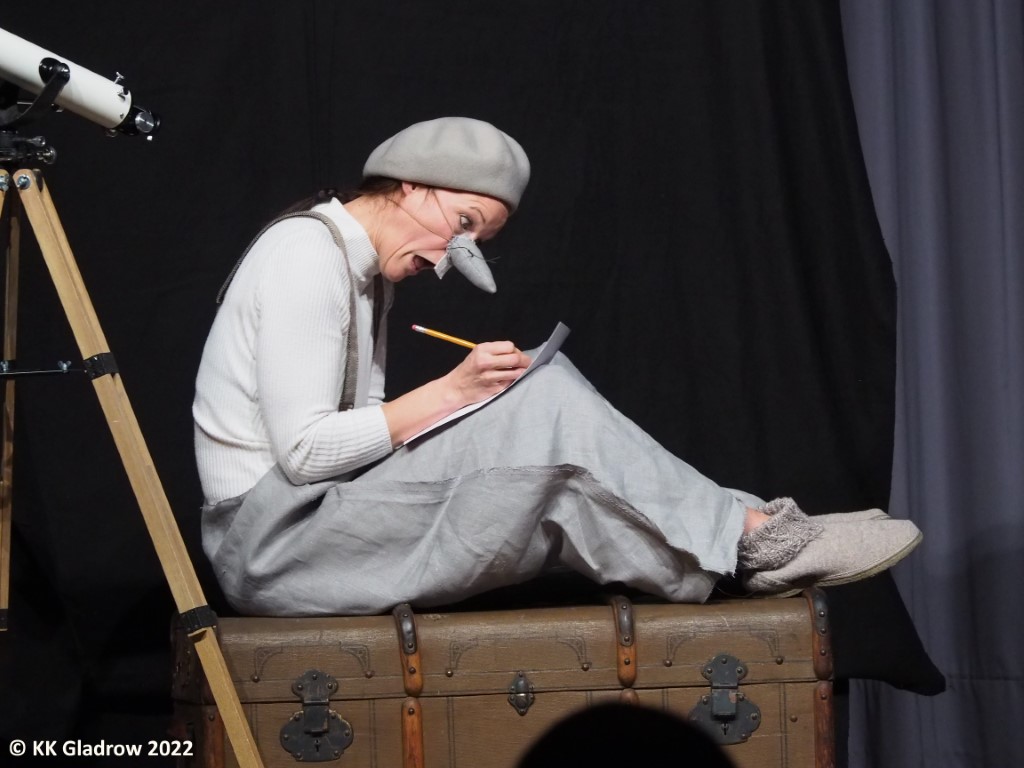 Gebannt folgen die kleinen und großen Zuschauer, wie die kleine Maus sich voller Kreativität ans Werk macht, allerlei Hindernisse überwindet. Es braucht nicht viel, eine Rakete zu bauen, die dann tatsächlich fliegt. Es braucht auch nicht besonders viel an Requisiten, dies darzustellen: Ein Teleskop, natürlich, Koffer für die Reiseutensilien, einen Schirm für das Raumschiff und selbstverständlich ein Fähnchen, das nach erfolgreicher Landung auf dem Mond in die Erde gesteckt wird. Leider hat der erste Mensch auf dem Mond, Armstrong, dieses Mäusefähnchen glatt übersehen – oder übersehen wollen? Nur so konnte er nämlich den berühmten Satz sagen: „Ein kleiner Schritt für einen Menschen – aber ein gewaltiger Sprung für die Menschheit.“ Tatsächlich gebührt die Ehre aber einer kleinen, hübschen Maus.