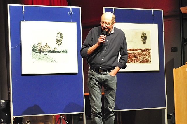 Eine kurze Umbaupause – die Bestuhlung für die Musiker muss immer wieder dem folgenden Programmpunkt weichen – füllt Zimmermann mit der Ankündigung der „Rheinhessischen Köpfe“. Der Künstler und Grafiker Bernd Koblischeck, hat in seinem Wörrstädter Atelier Georg Scheu, Carl Zuckmayer und den Architekten Johann Paul Wallot als Kaltnadel-Radierungen “auf die Platten gebannt” und erläutert gut verständlich dieses Tiefdruckverfahren. Das “Rheinhessen-Quiz” mit Fotos von Helmut Weidlich zeigt Details von Brunnen, Türmen und Trulli, gerät jedoch etwas zu einfach, weil die Namen der gezeigten Objekte stets am oberen Rand der Leinwand lesbar bleiben.
